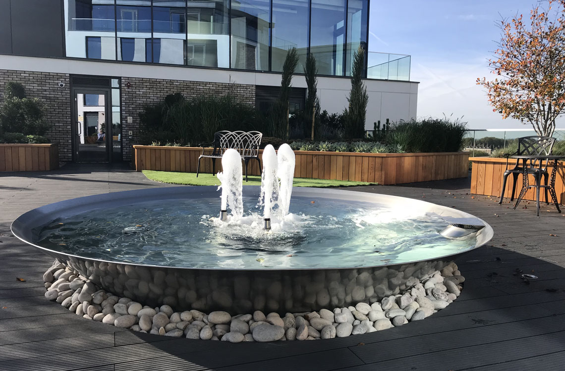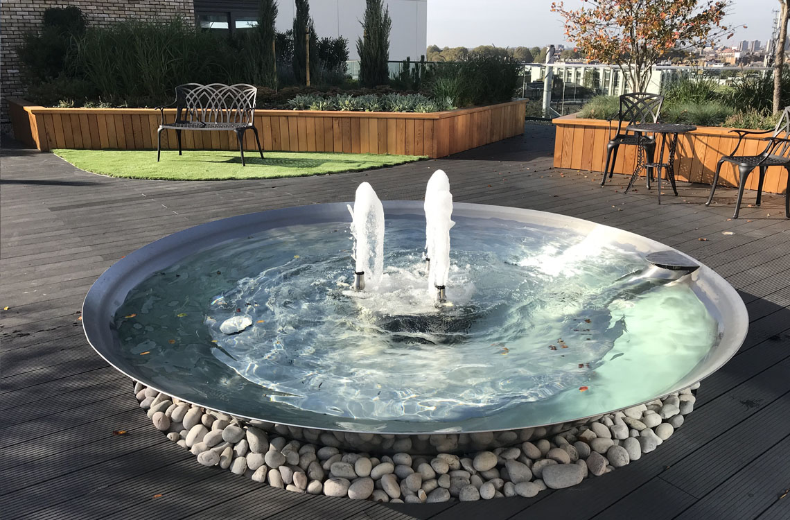 A 3 metre diameter mirror polished stainless-steel conical flat based bowl creates a striking focal point to visually enhance this water feature on a sixth floor roof top terrace at a luxury residential development. The reflective nature of the bowl helps to create a sense of well-being and calm, a perfect sanctuary from the stresses of the city.
