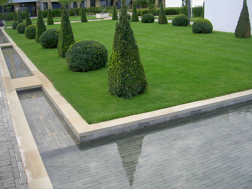 The water feature surrounds a central lawn and consists of upper and lower pools connected by two shallow rills.