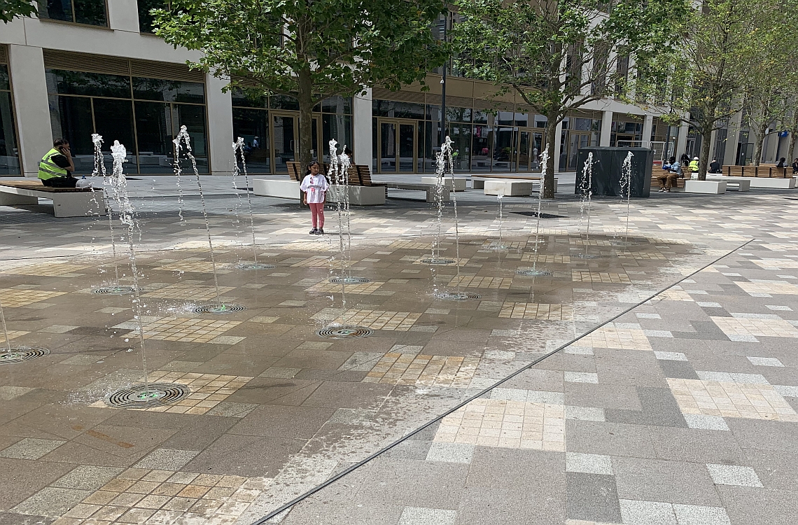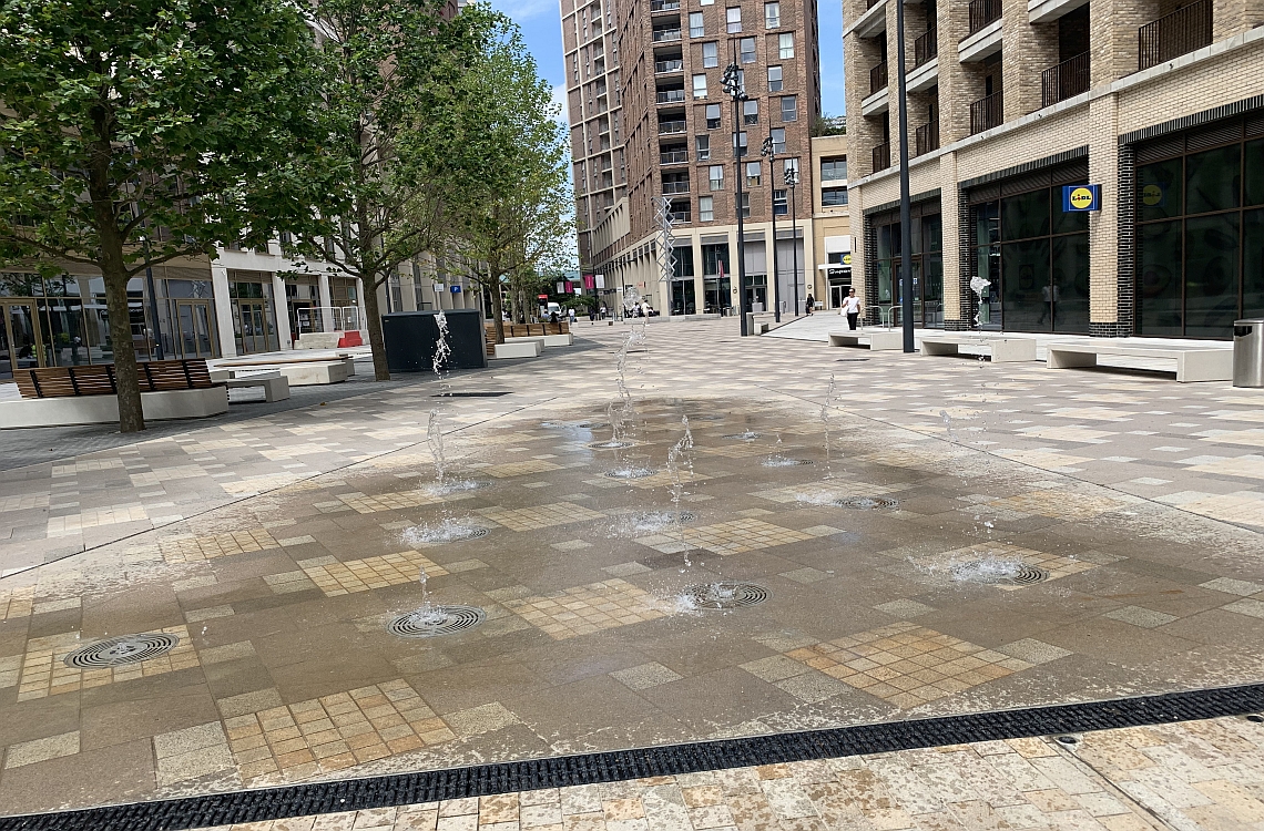 This plaza water feature, which was formerly a part of London’s busy and historic Royal Docks, is part of a major mixed regeneration project in the Canning Town district of East London.
