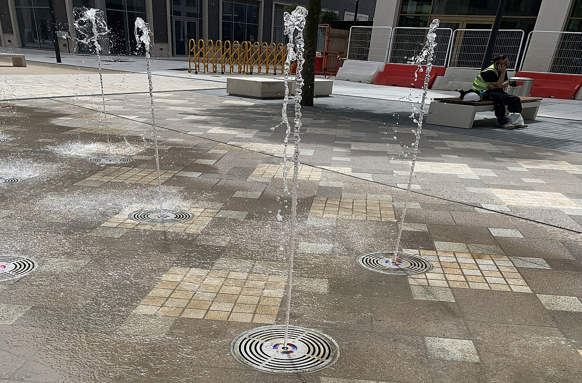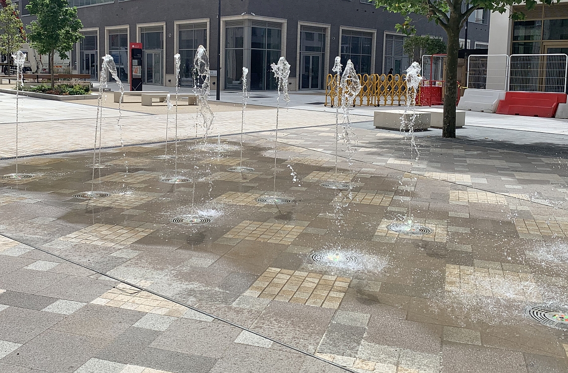 Interconnected water storage pods, separate DMX-controlled pump units for each jet, distribution pipes and nozzles, feature lighting, a water holding tank, cross-site pipework, water return floor grates suitable for pedestrian loading are located beneath the paving. The water treatment plant together with the necessary control and monitoring systems are located in a basement plant room.