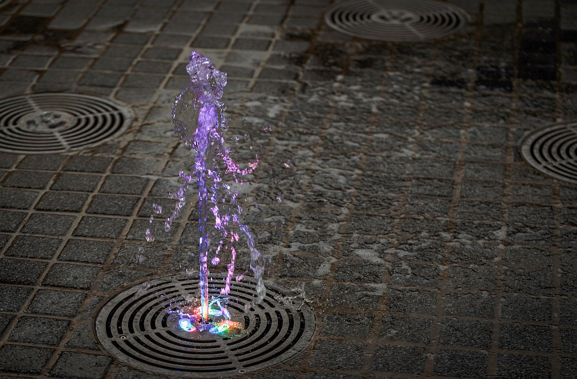 Activity Square hosts a ‘plaza’ type water feature arranged in a large triangular layout consisting of 25 individually controllable DMX display pumps located in stainless steel pods below the surrounding paved area. Each grate is fitted with an individually controllable RGB (Red/Green/Blue) LED that illuminates the water as part of the display and each jet has a rising fog effect.