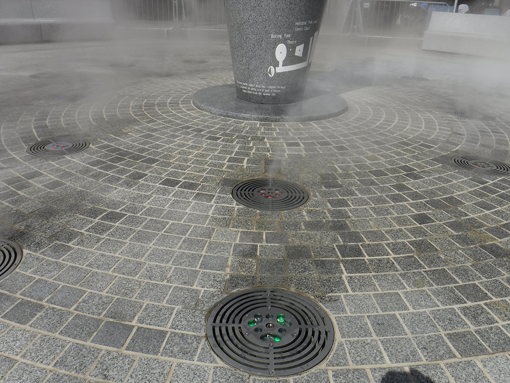 To create a different effect a misting system has also been incorporated which will emanate from each of the water return grates to create a different atmosphere around the statue when the jets are not running.