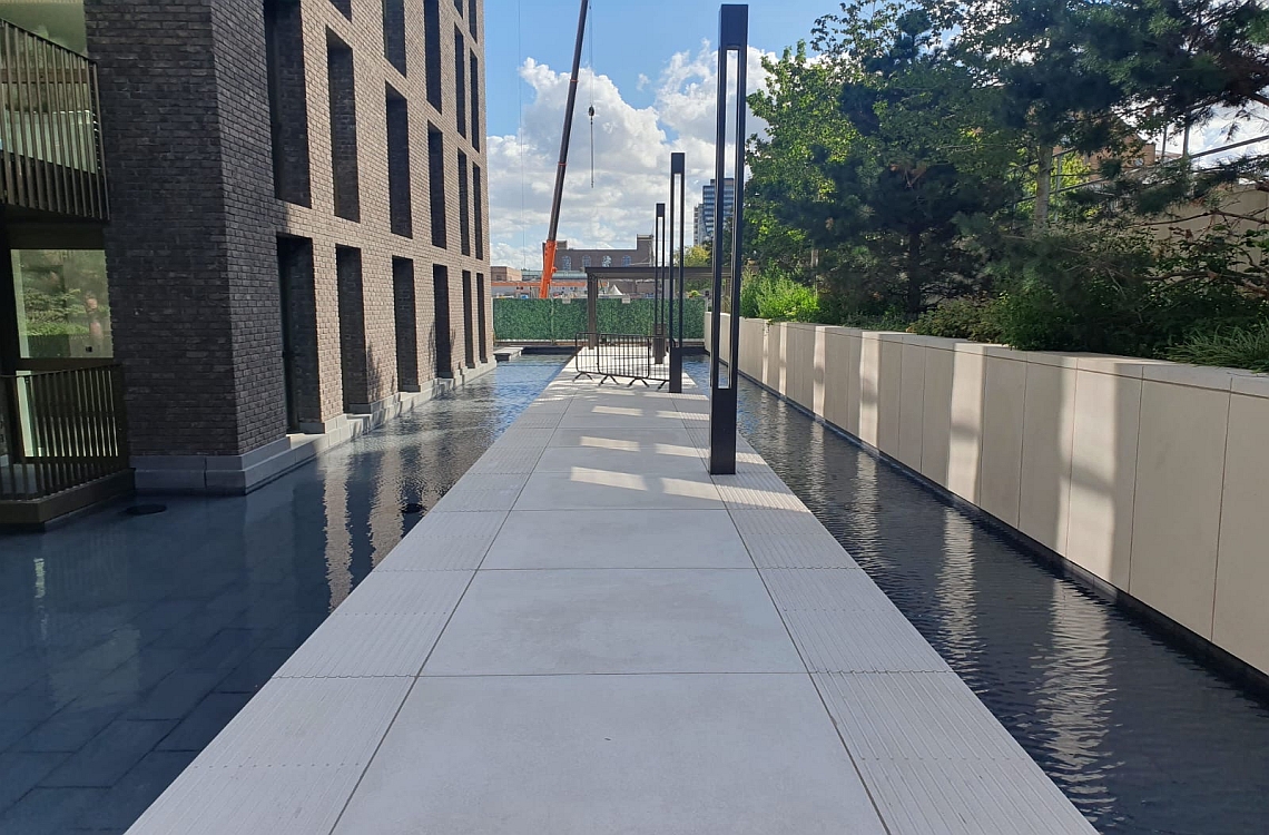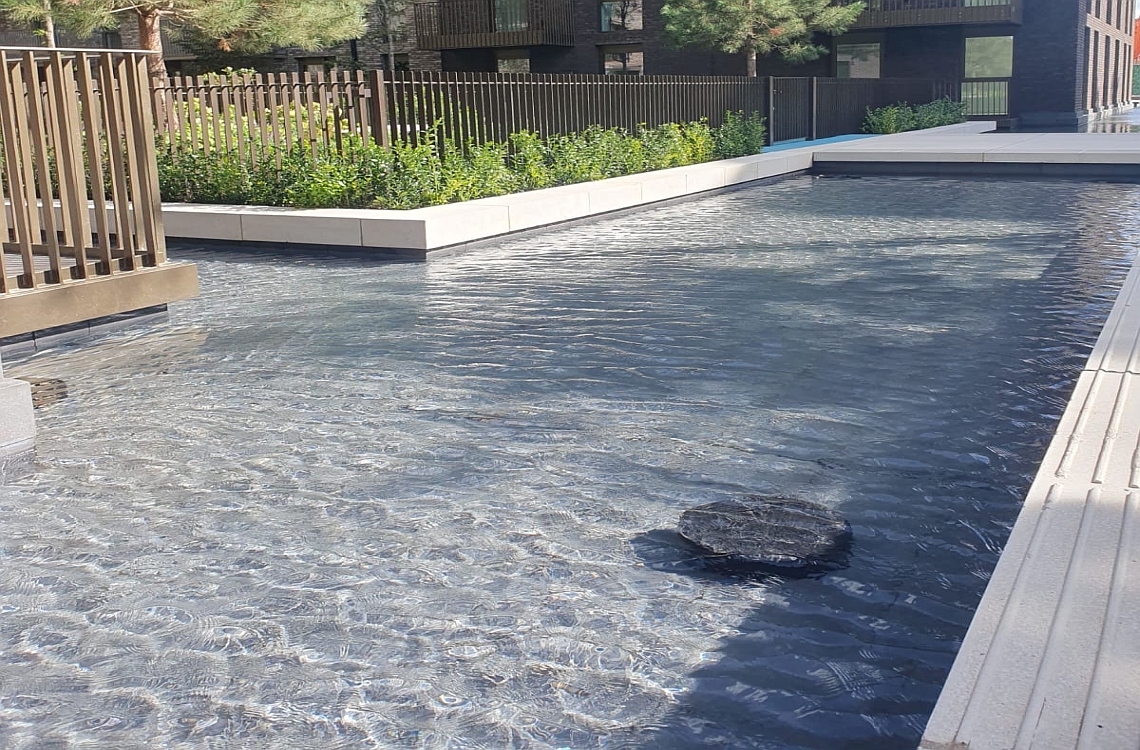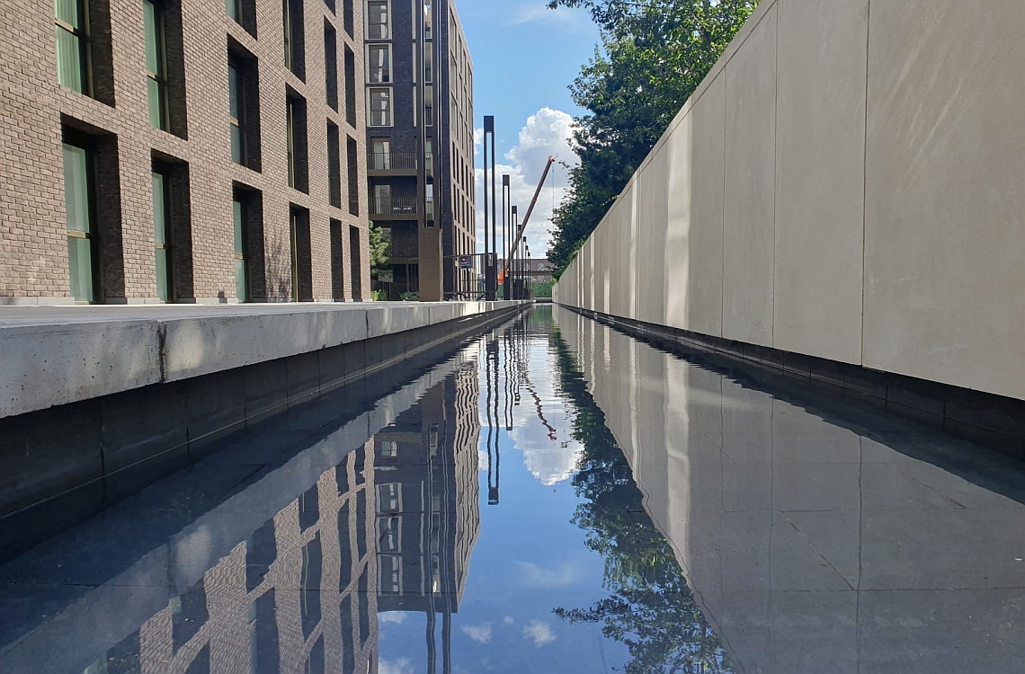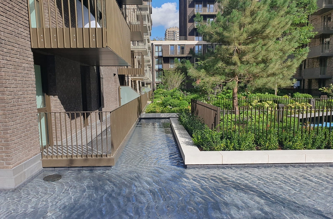 The water feature at Block F reflects elements from the prior phase and appears to give the impression it is a continuation of the canal-style feature found on both sides of the promenade. Shallow, still water bodies on either side of a footpath create a still, reflective surface. In the garden courtyard with plants, the canal on the north side of the feature aligns with the shape of the courtyard