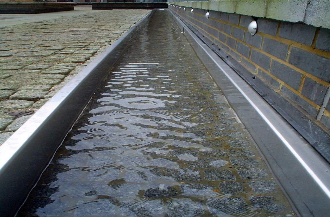 The areas for the rills are approximately 400mm wide, 160mm deep and vary in length between 4 and 18 metres. Each rill has a dedicated inlet and outlet pipe and the water runs over granite sets which gives the water a surface ripple effect.