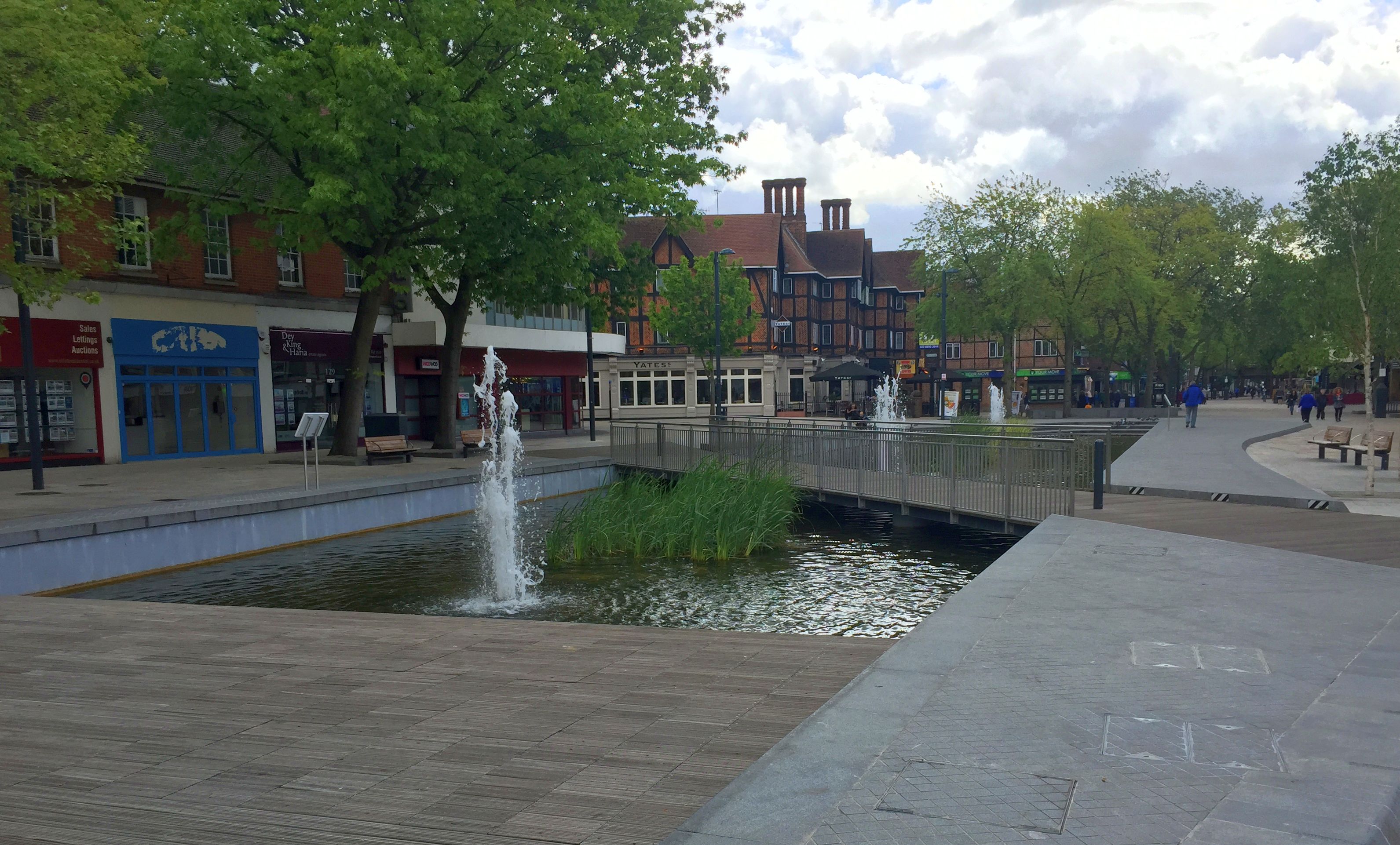 Three display fountains located within a town centre pond. The fountains are each fitted with 5 cascade-type jets and 4 LED white lights.